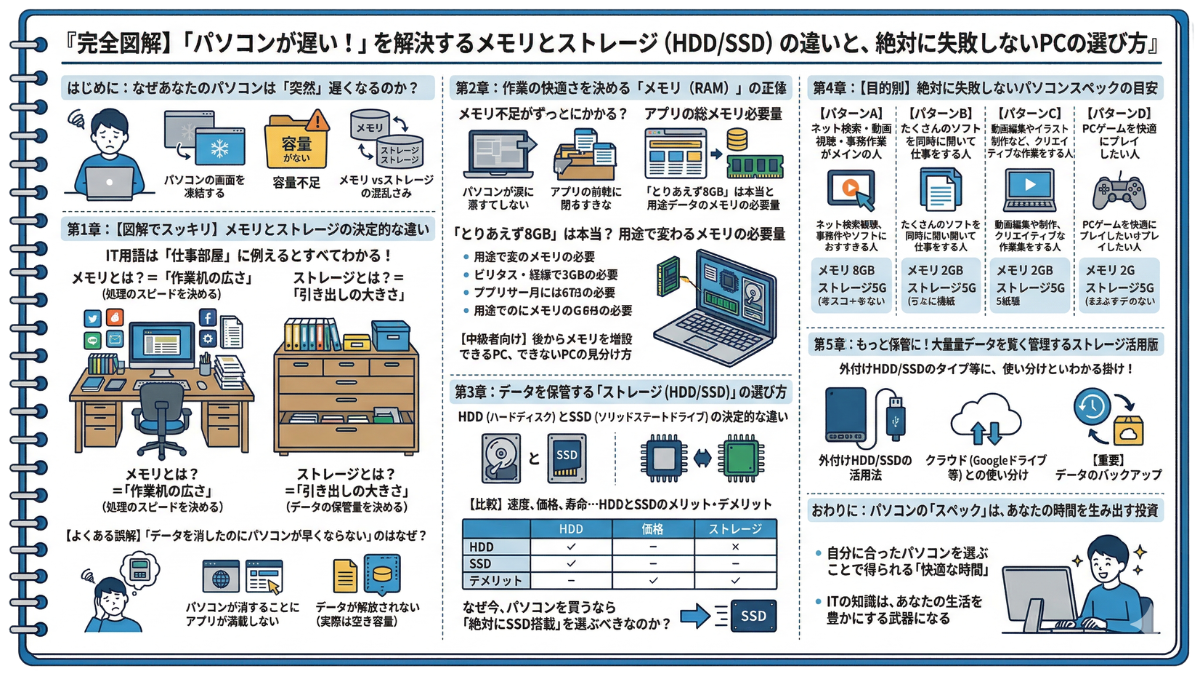 『【完全図解】「パソコンが遅い!」を解決するメモリとストレージ(HDD/SSD)の違いと、絶対に失敗しないPCの選び方』