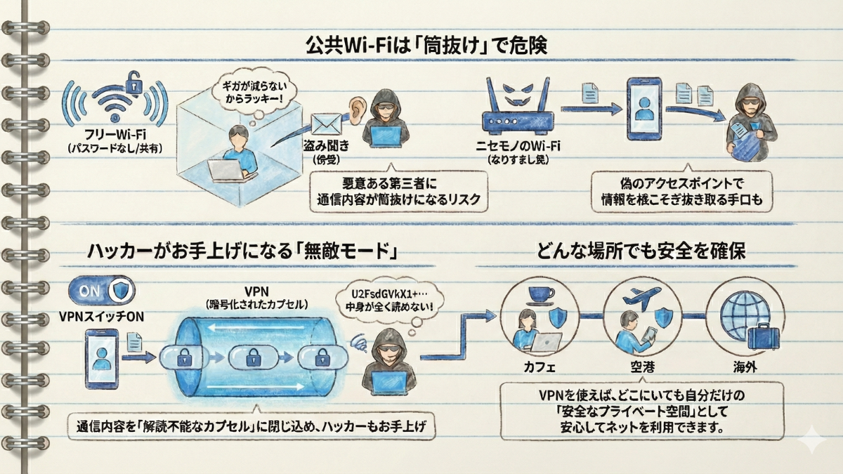 特に、カフェやホテル、空港などの**「フリーWi-Fi」は、誰が同じネットワークに潜んでいるか分かりません。 VPNを使わずにこれらを利用してログインや買い物をするのは、「財布の中身を見せびらかしながら人混みを歩く」**のと同じくらいリスクが高い行為だと言われています。
