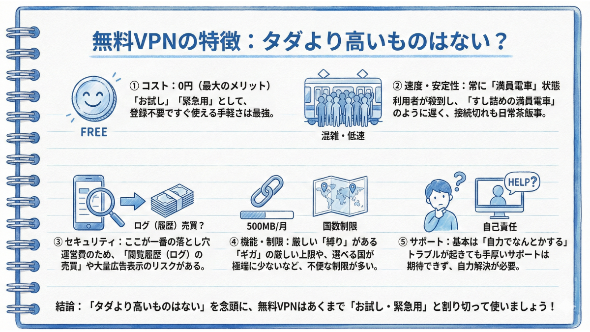 A. 無料VPNはコストがかかりませんが、速度が遅い、データ通信量に制限がある、セキュリティが脆弱、広告が表示されるといったデメリットがあります。また、最悪の場合、ユーザーのデータを収集して販売している業者も存在します。セキュリティと快適さを求めるなら有料VPNが推奨されます。