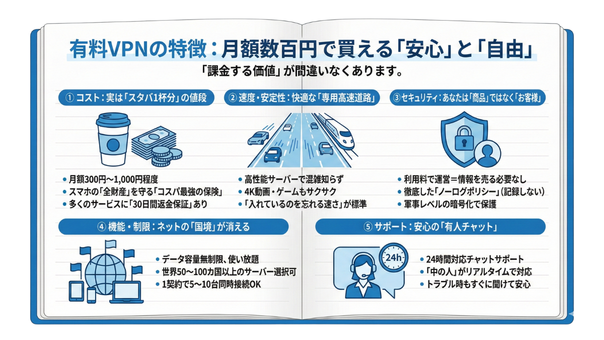 選ぶなら「有料版」一択: 無料版は「タダより高いものはない(情報売買のリスク)」です。月額数百円の投資で、安心と快適さを買いましょう。