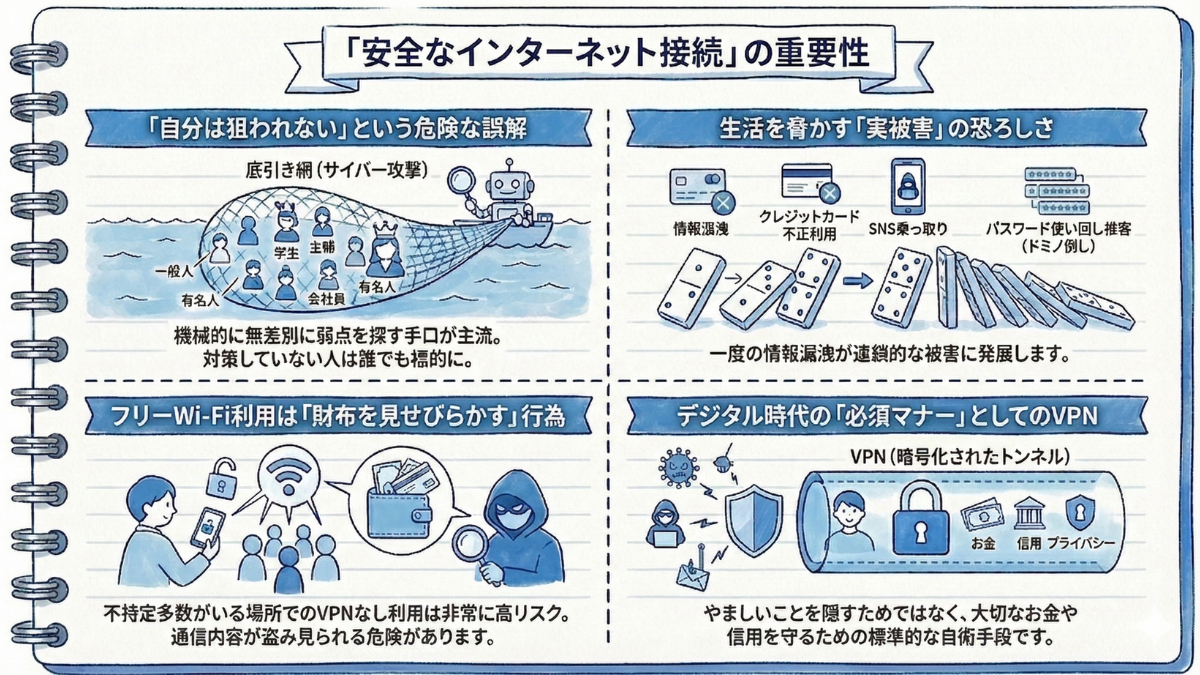 だからこそ、VPNで通信を暗号化して「守る」ことが重要なんです。 これは「やましいことを隠す」ためではなく、「あなたの大切なお金や信用を守る」ための、デジタル時代の必須マナーになりつつあります。