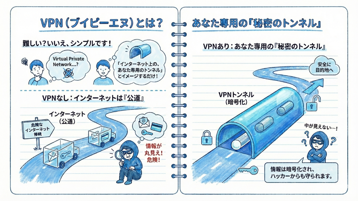 でも、安心してください。 難しいIT用語を覚えなくても、この仕組みは「インターネット上に作られた、あなた専用のトンネル」だとイメージするだけで、驚くほど簡単に理解できるんです。