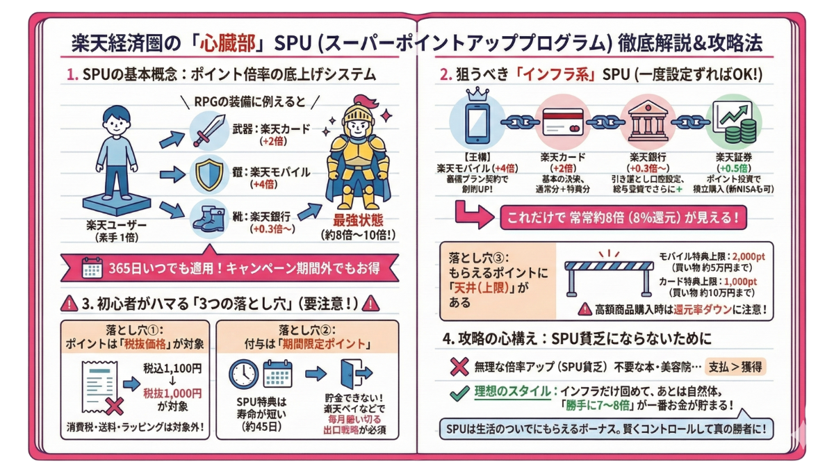 なぜ他の経済圏(PayPay経済圏やドコモ経済圏)ではなく、楽天がこれほど支持されるのでしょうか? その答えは、楽天独自の最強システム「SPU(スーパーポイントアッププログラム)」にあります。