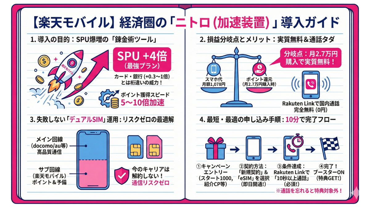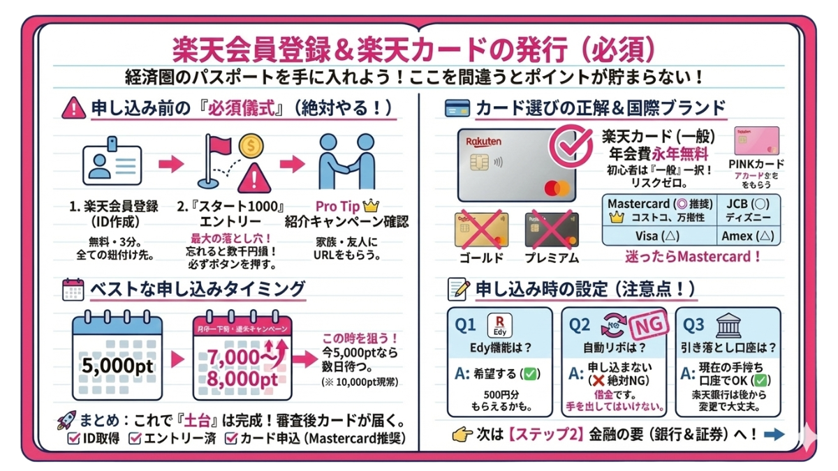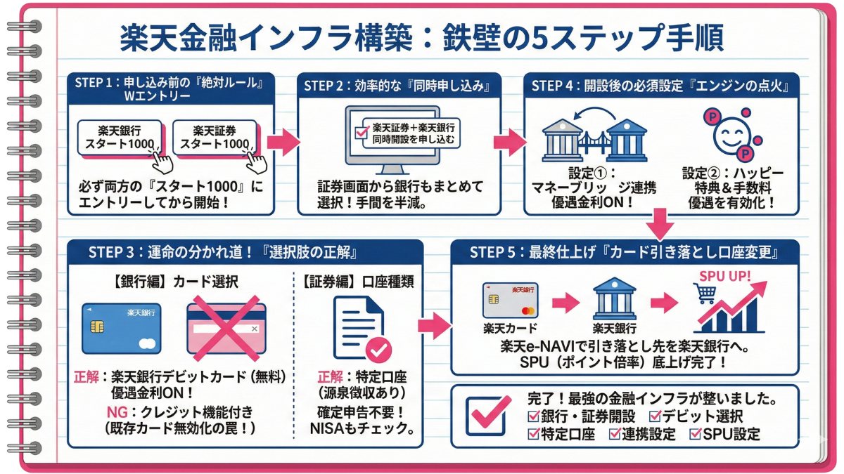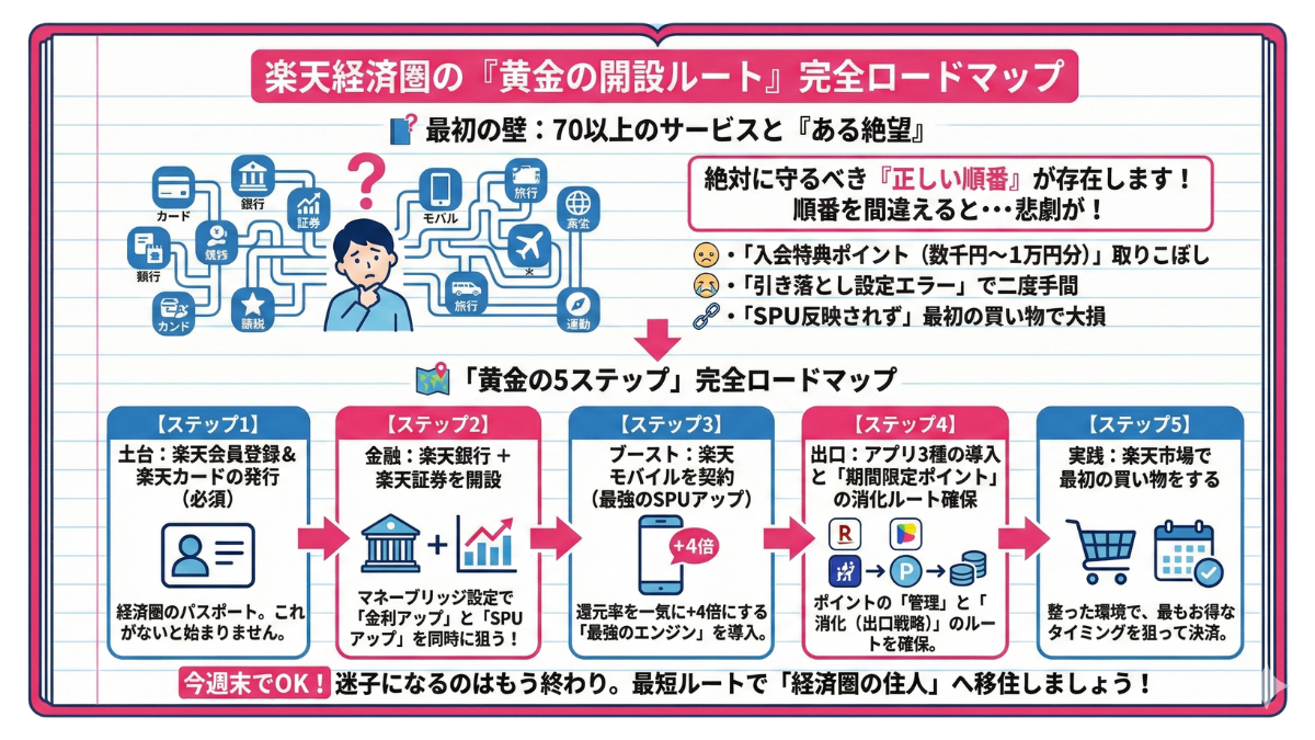 楽天経済圏には、効率よくポイント倍率(SPU)を上げていくための「黄金のルート」が存在します。適当に手をつけてしまうと、本来もらえるはずだった入会特典ポイントを取り逃がしたり、設定が二度手間になったりしてしまいます。