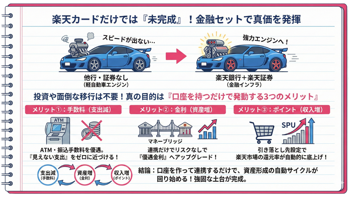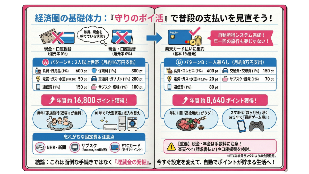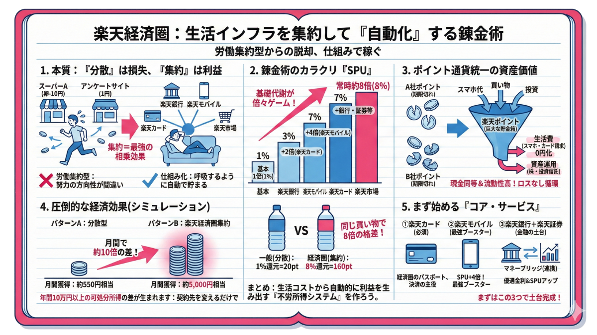 楽天経済圏とは、単なるポイント集めではありません。「分散している支出をシステム化し、自動的に利益を生む仕組みを構築すること」です。