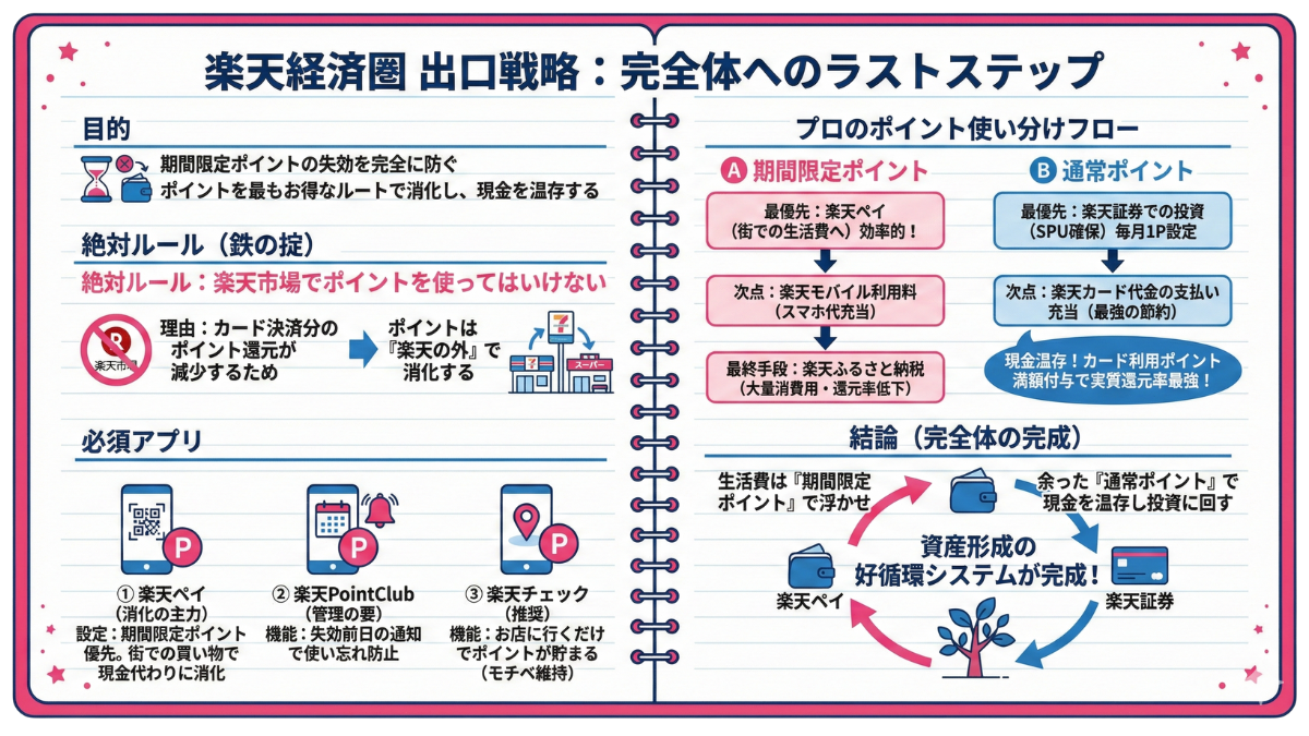 期間限定ポイントは、あくまで「消費」のためのポイントです。  しかし、**「通常ポイントを使って投資信託を買い、浮いた現金を期間限定ポイントで補う(楽天ペイ等)」**と考えれば、間接的に資産形成に貢献していることになります。  「通常Pは投資へ、限定Pは生活費へ」と役割分担をしましょう。