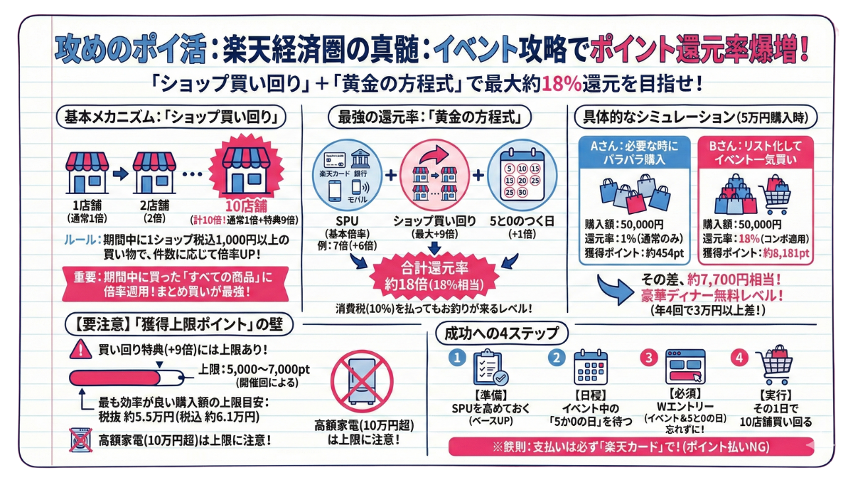 【⚠️重要:獲得上限(キャップ)について】 「ポイント無限取り」はできません。SPUや各種キャンペーンには、それぞれ「月間獲得上限ポイント」が設定されています(例:楽天モバイル特典は上限2,000ポイントなど)。 パソコンや高級家電など数十万円の買い物をする際は、計算途中で上限に達し、還元率が下がることがあるため注意が必要です。