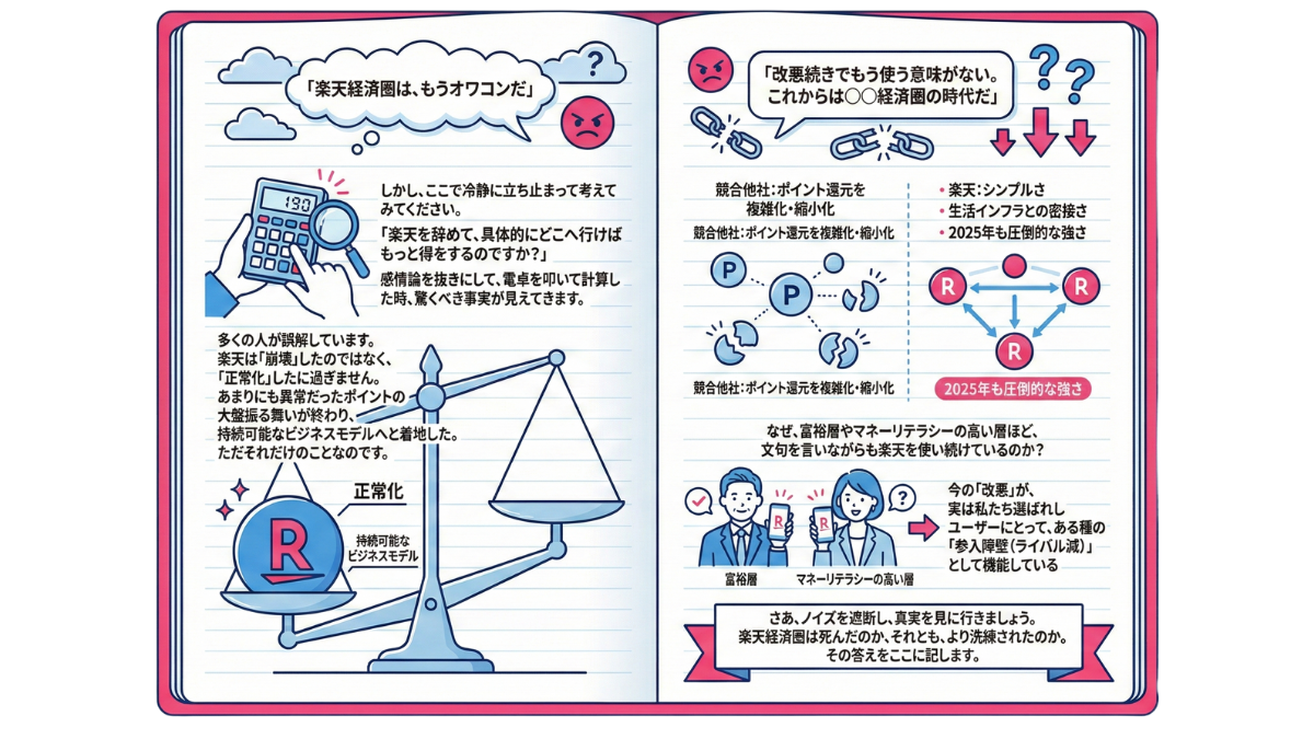 確かに「誰でも簡単に月数万ポイント稼げる」というボーナスタイムは終わりつつあります。  しかし、Amazonに対抗できる国内物流網、通信(モバイル)、金融(銀行・証券)がすべてID一つで連携している利便性は、他の経済圏にはない強みです。  「儲ける」のではなく**「生活コストを最適化する」**という視点で見れば、2025年以降も楽天経済圏は最強のツールであり続けるでしょう。