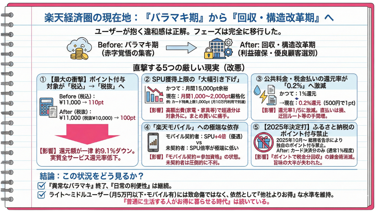 確かに、2020年頃の楽天経済圏は、異常なほどポイントをバラまいていました。それに比べれば、2025年の今は「渋く」なったように見えるかもしれません。