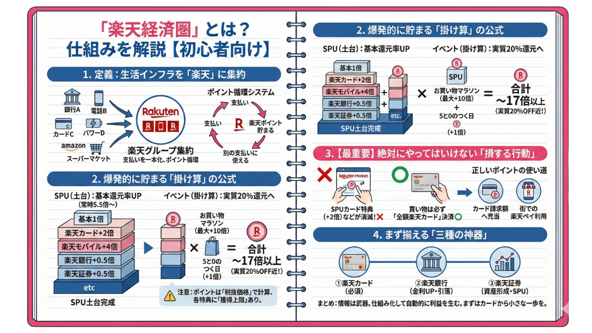 本記事では、これから「楽天経済圏」への参入を考えている方に向けて、その定義から、ポイントが爆発的に貯まる「カラクリ(仕組み)」、そして初心者が一番ハマりやすい「損をする落とし穴」までを、ノートにまとめるように体系的に解説します。