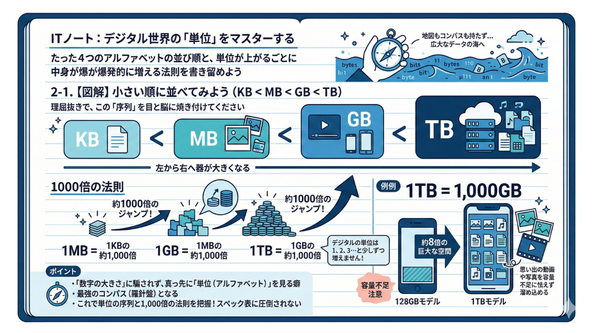 基本の序列は「KB < MB < GB < TB」です。右に行くほど「器」が巨大になり、単位が1つ上がるたびに大きさは「約1,000倍」になります。階段を1段上るたびに桁が3つ増える、爆発的な進化をイメージして覚えましょう。