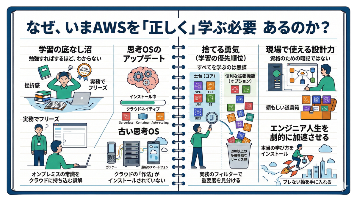 それは、あなたが努力していないからでも、エンジニアとしてのセンスがないからでもありません。ただ、AWSに対する「学び方のルール」を誤解しているだけなのです。