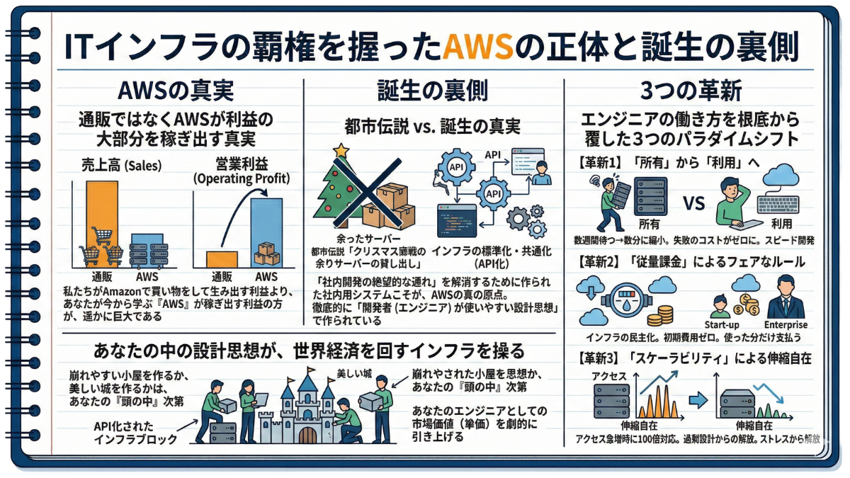 しかし、その程度の理解では、現場で生きたインフラを設計することはできません。AWSの全貌を正しく把握するためには、「何であるか」だけでなく、「なぜ生まれ、どうやって世界を制したのか」を紐解く必要があります。