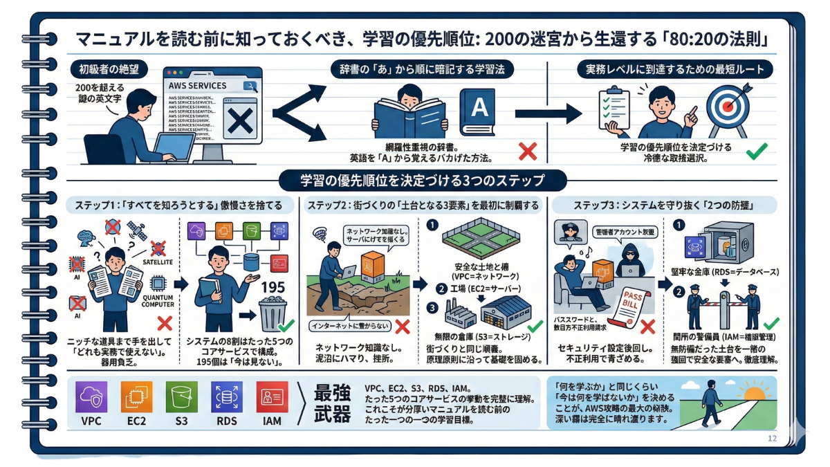 そして、視界を劇的にクリアにするもう一つのカギ。それが「捨てる勇気(学習の優先順位)」です。 現在のAWSには、200を超える多種多様なサービス群が存在します。これらをすべて均等に学ぼうとするのは、フルマラソンを全速力で走り出そうとするような無謀な行為です。実務において、すべてのサービスをマスターする必要は一切ありません。入門書を開く前に絶対に知っておくべきこと。それは「どのサービスがインフラの『土台(コア)』であり、どれが便利な『拡張機能(オプション)』なのか」を瞬時に見分ける、プロのフィルターです。