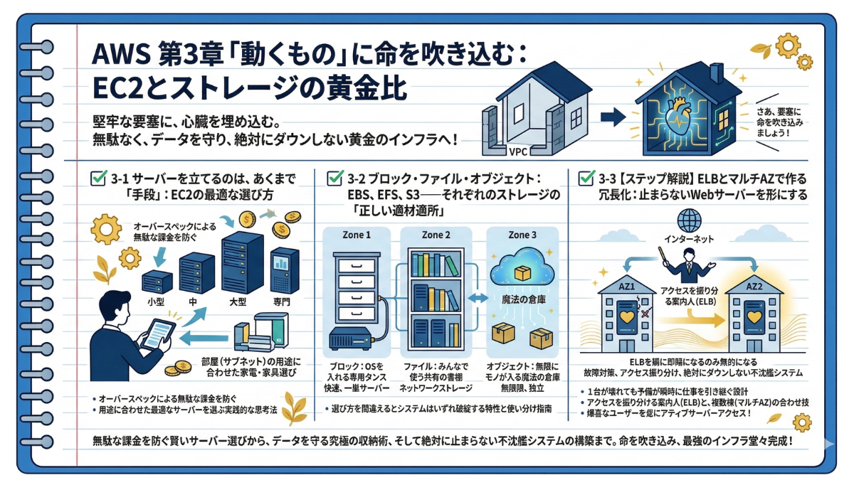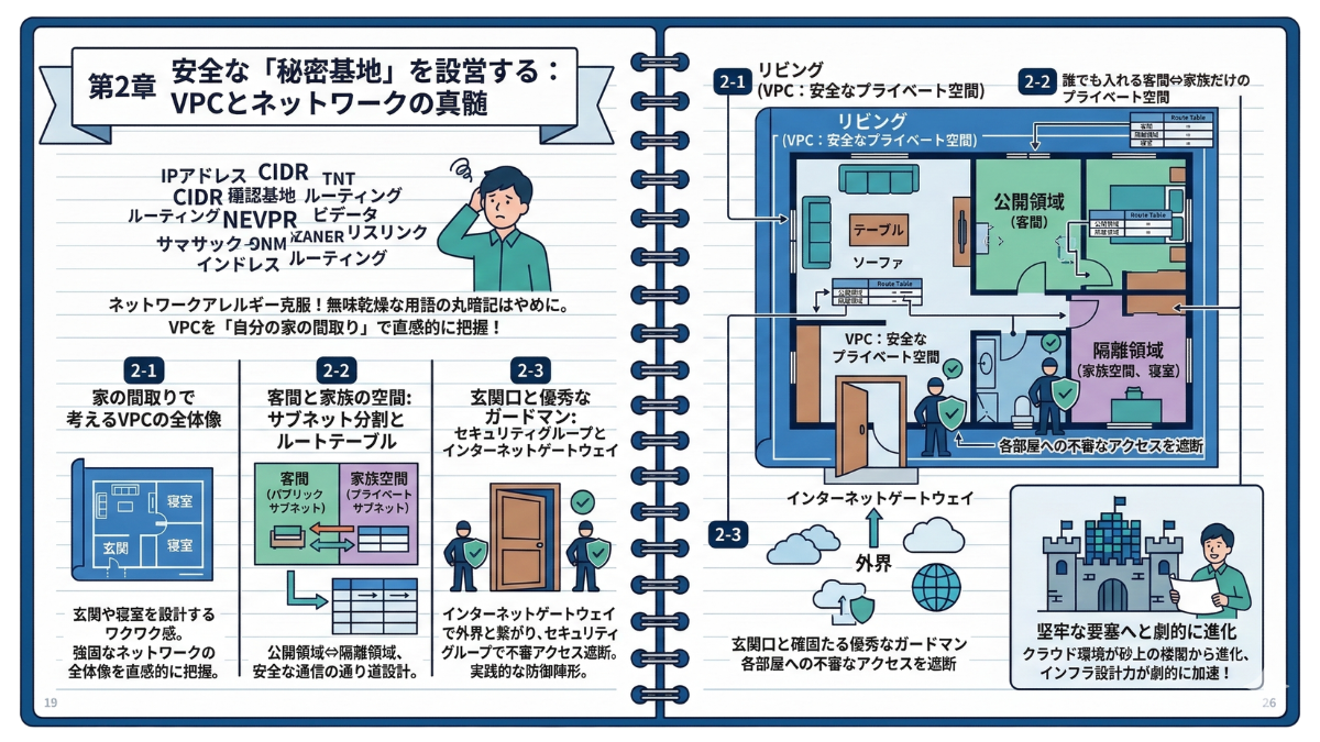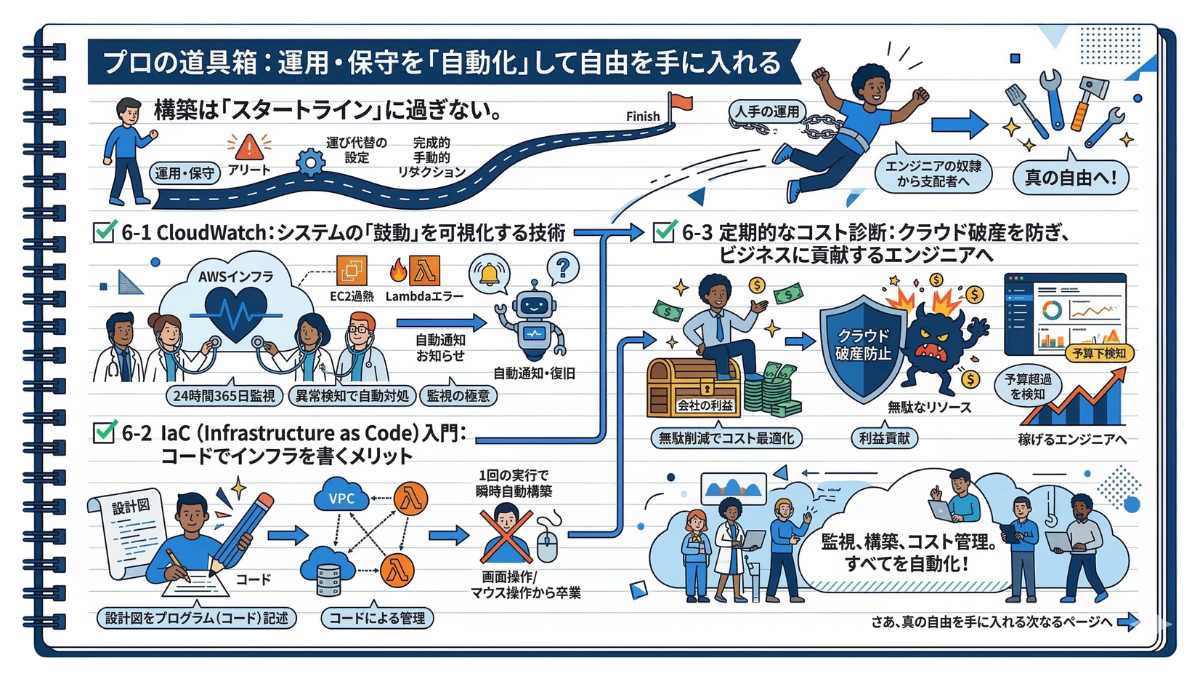 VPCという見えないネットワークの壁を手探りで構築した第1章。サーバーレスという常識を覆す魔法に触れ、自動化というプロの道具箱を手に入れた第6章。ここで共に学び、実際に手を動かしながらあなたが書き留めてきた「ITノート」には、もはや初学者の頃の迷いはありません。設計図を読み解き、自らの力でクラウド上に堅牢なシステムを立ち上げる確かな実力が備わっています。