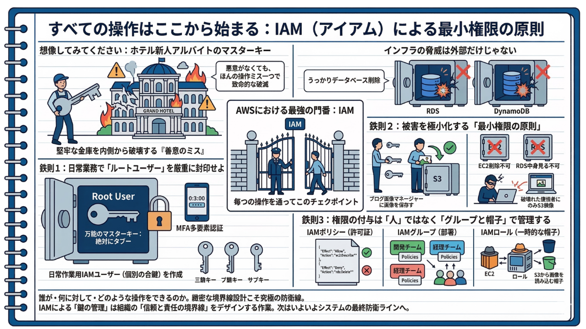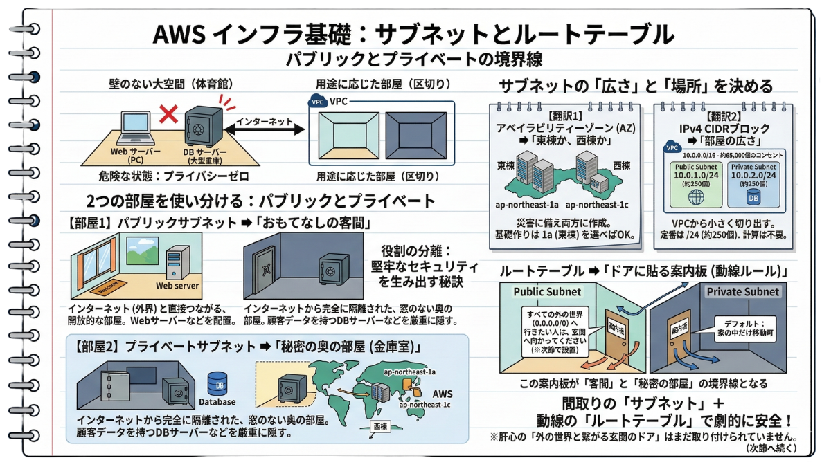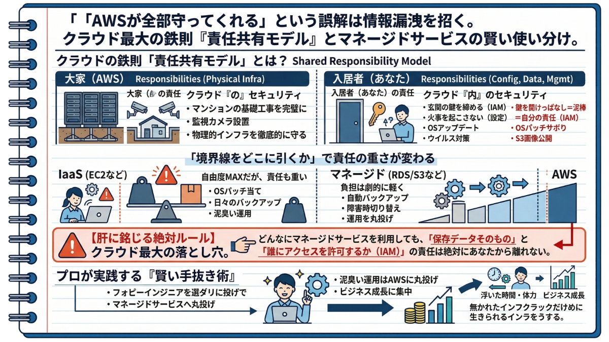 AWSには「責任共有モデル」が存在します。当サイトが提供する情報はインフラ設計の補助を目的としたものであり、OSのセキュリティパッチ適用、データのバックアップ、IAMによる適切な権限管理など、利用者の責任範囲に属するセキュリティ対策を免除するものではありません。