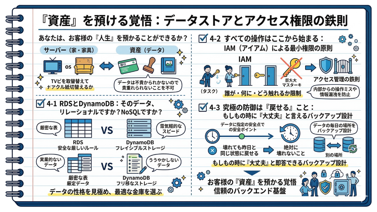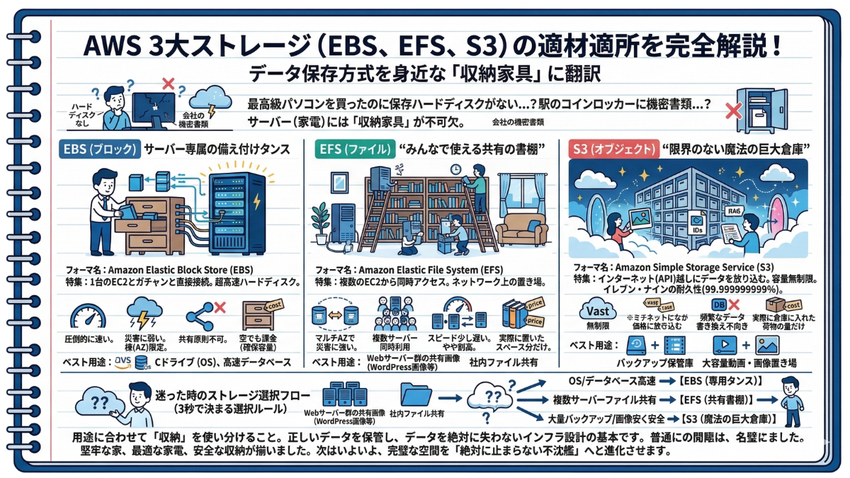 ⭕️ サーバーの中身は常に「空っぽ」にし、データはS3やRDSなど外部の専門サービスに完全に切り離して保存する。