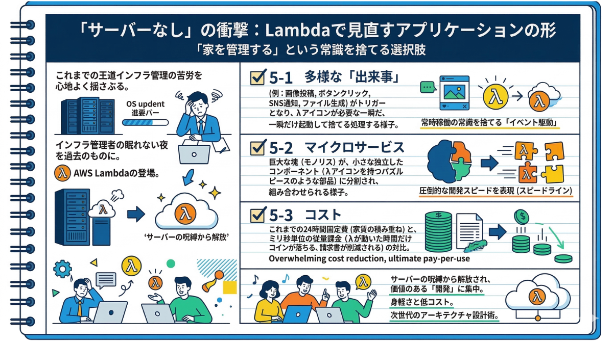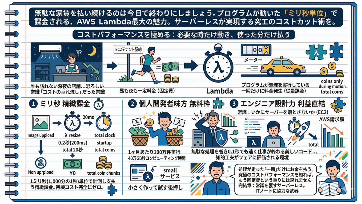 例えば、24時間稼働を前提として重厚なEC2を立ち上げるのか、それとも第5章で学んだミリ秒単位で課金される身軽なLambdaを選ぶのか。これは単なる技術的な好みの問題ではありません。「固定費を許容して安定を狙うか、変動費にしてリスクを抑えるか」という、経営者のキャッシュフロー戦略そのものです。AWSの構成図を引くことは、企業の家計簿をデザインすることと同義なのです。