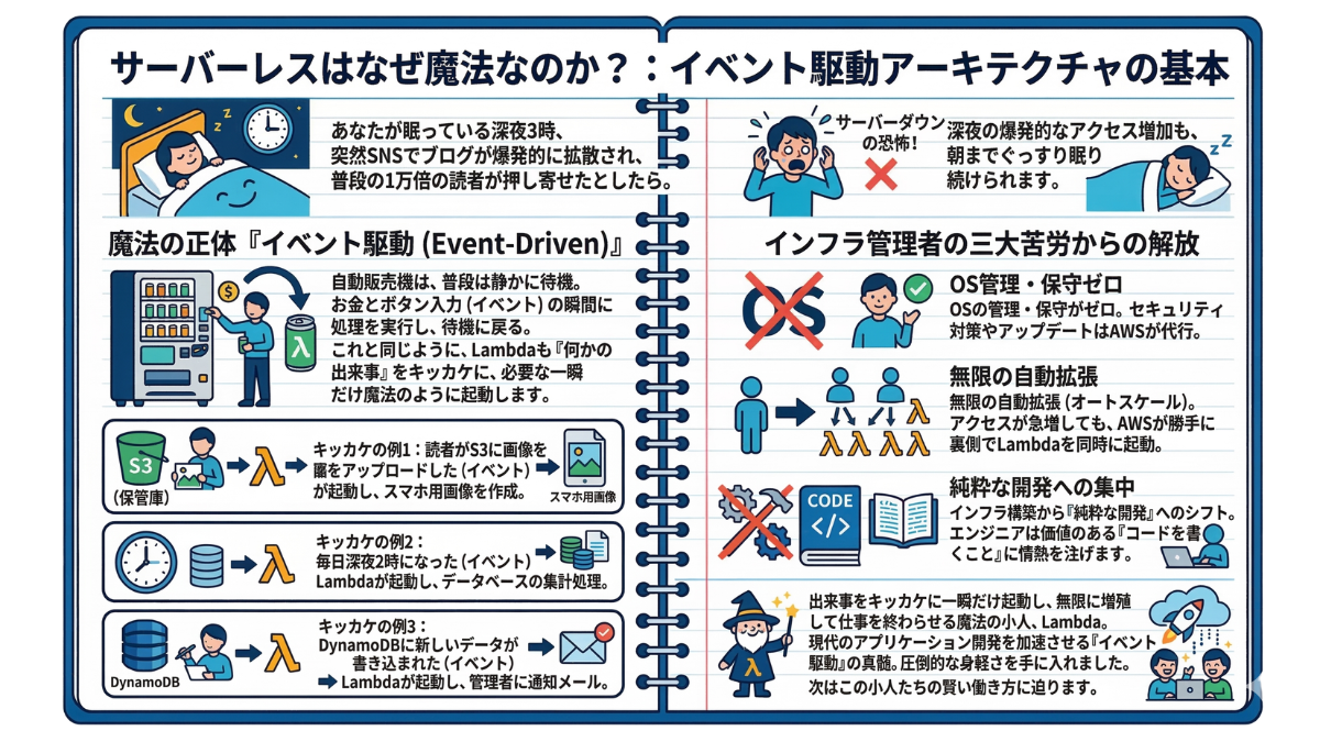 いよいよ、この壮大な連載も次が最後の章です。『【終章】技術の先にある、あなたの価値』へ続きます。 ゼロからインフラを学び、サーバーレスの魔法を知り、自動化の武器を手に入れたあなた。これらの知識が、今後の人生とキャリアをどう変えていくのか。