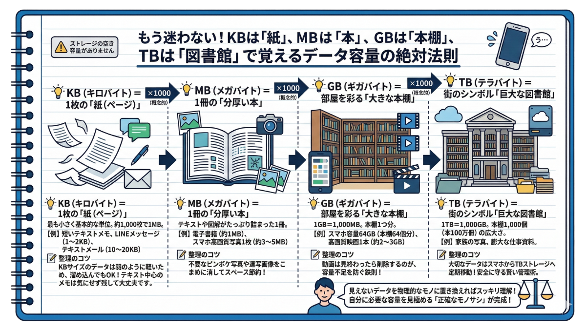 2-2. もう迷わない!KBは「紙」、MBは「本」、GBは「本棚」、TBは「図書館」で覚えるデータ容量の絶対法則