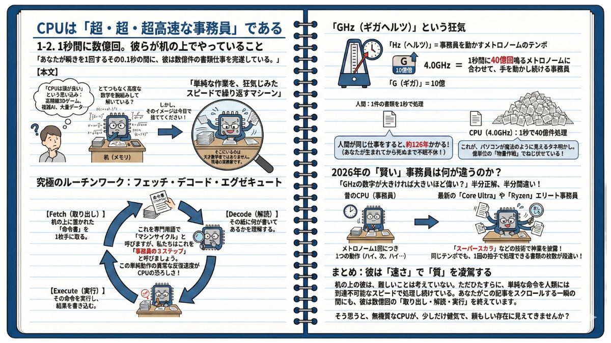 情報の正確性と鮮度について 本連載は「2026年現在」の市場動向や技術水準に基づき作成されています。また、専門的なCPUの構造を理解しやすくするため、「シェフ」や「まな板」などの比喩表現を用いて単純化して解説しています。学術的・技術的な完全性や最新性を常に保証するものではありません。