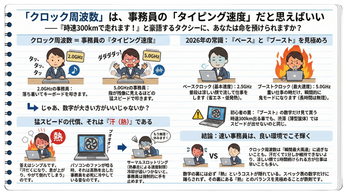 1-3. 「クロック周波数」は、事務員の「タイピング速度」だと思えばいい