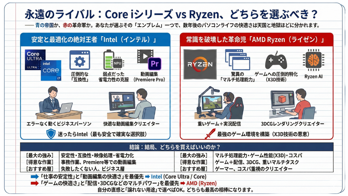 ご購入における最終判断 記事内の推奨スペック、メーカー(Intel、AMD、Appleなど)の適性、およびグレードの目安は、著者の経験に基づく見解です。実際のソフトウェアの動作環境や体感速度を確約するものではありません。パソコンのご購入や買い替えに関する最終決定は、読者ご自身の責任で行ってください。