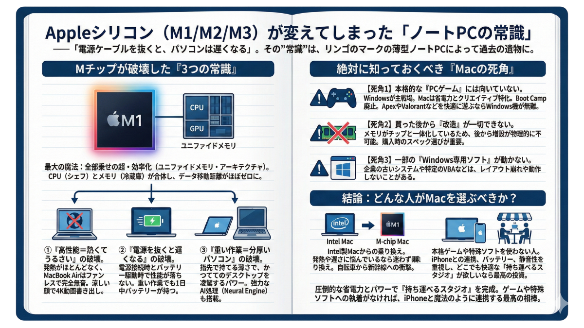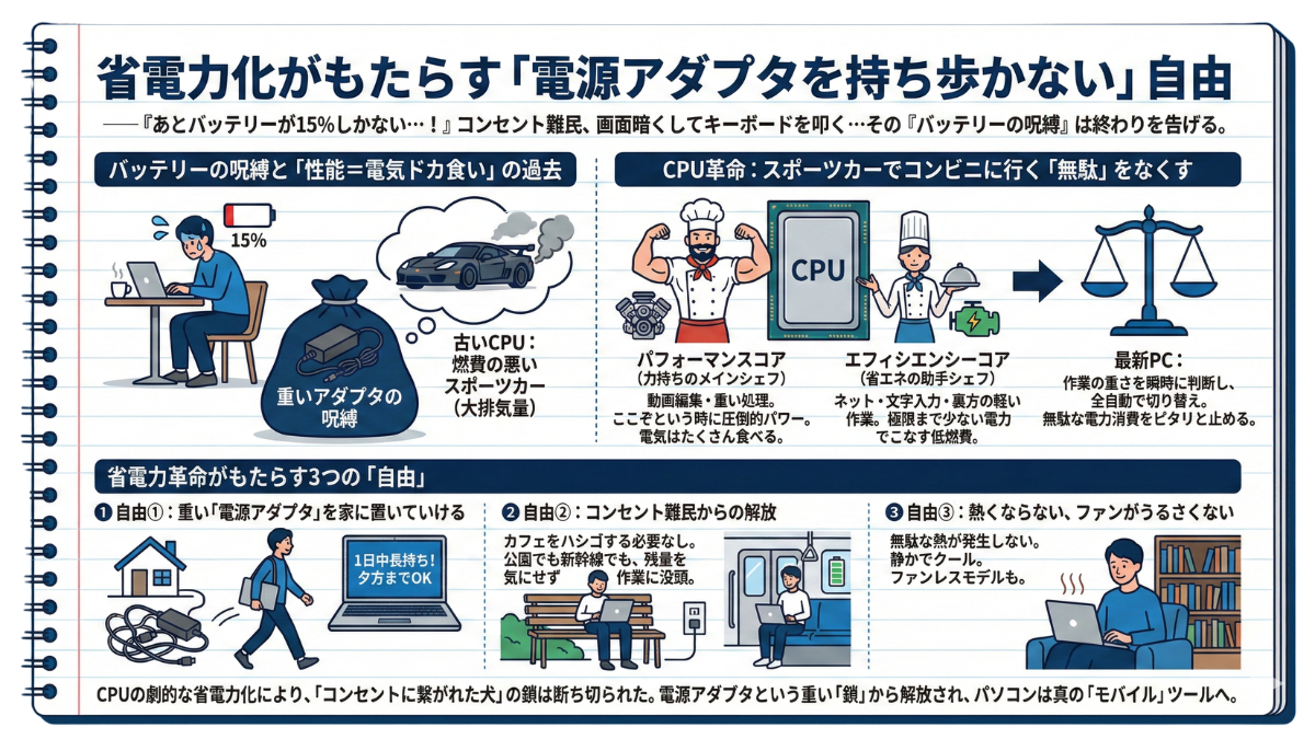 ■ 従来の「バッテリー問題」の原因 昔のパソコンは、軽い作業でも常に全力を出す「燃費の悪いスポーツカー」状態だったため、無駄な電力を消費してすぐにバッテリーが切れていた。 ■ 解決策:2つのコアの使い分け(ハイブリッド・アーキテクチャ) 作業の重さに応じて、異なる性質を持つ「2つの小部屋」を全自動で切り替え、電気のドカ食いをストップする最新技術。 ① パフォーマンスコア(力持ちのメインシェフ): 動画編集など、圧倒的なパワーが必要な重い作業を担当。 ② エフィシエンシーコア(省エネの助手シェフ): ネット閲覧や文字入力など、軽い作業を極限まで少ない電力でこなす。 ■ 次世代CPUがもたらす「3つの自由」 最新の省電力CPU(M3/M4、Snapdragon X、Intel Core Ultraなど)により、以下の自由が手に入る。 自由① 重い電源アダプタからの解放: 1日中バッテリーが持つため、重いACアダプタを家に置いたまま身軽に出かけられる。 自由② コンセント難民からの解放: カフェや移動中など、充電できる席を探すことなく、好きな場所で即座に作業に没頭できる。 自由③ 発熱・騒音からの解放: 無駄な電力を使わないためPCが熱くならず、冷却ファンの爆音も気にせず静かに使える。 ■ 結論 次世代CPUの登場により、「高性能=バッテリーが持たない」という常識は崩壊。パソコンはコンセントという「鎖」から解放され、いつでもどこでも使える真のモバイルツールへと進化した。