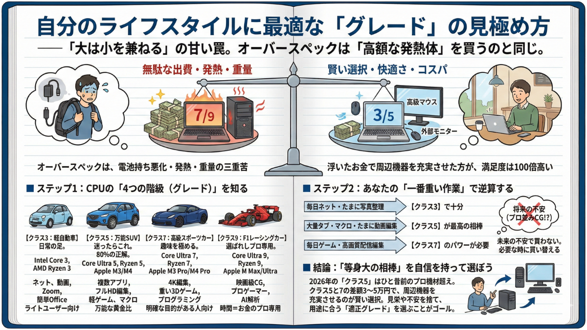 パソコンも、これと全く同じです。最高級のCPUが、あなたの用途にとって「正解」とは限らないのです。
