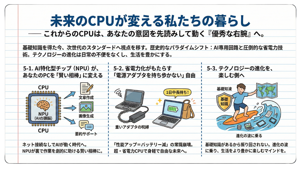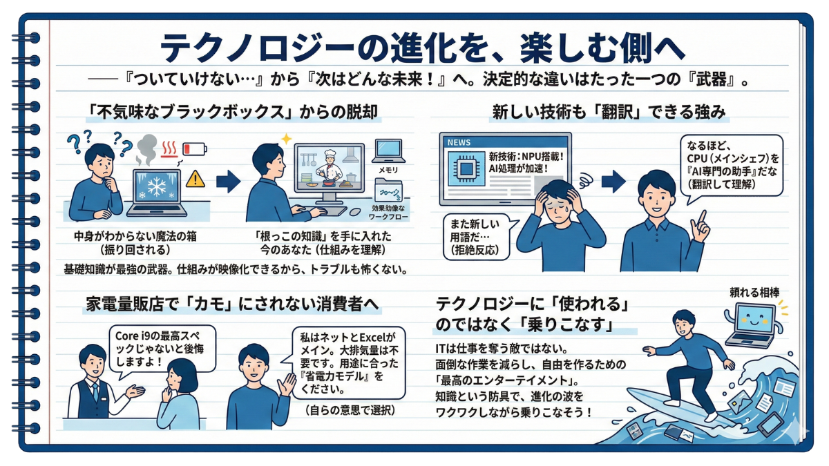 長かった「CPU探求の旅」も、そろそろ最終回に近づいています。「CPUの知識」という最強の武器を手に入れたあなたが、今後どうやってテクノロジーと付き合い、豊かな生活を送るべきか。そのマインドセットをお伝えします。