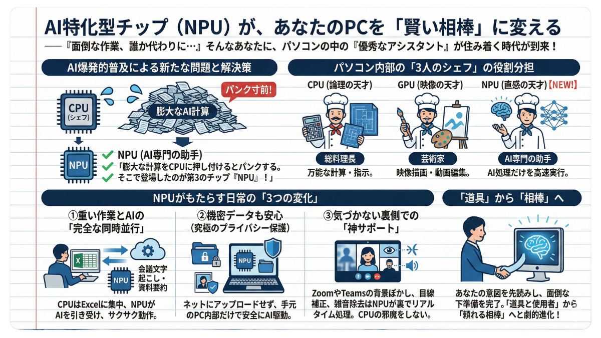 例えば「NPUという新しいAIチップが出ました」というニュースを見ても、以前のあなたなら「また新しい用語だ…」と拒絶反応を示していたかもしれません。しかし今のあなたなら、「なるほど、メインのシェフ(CPU)を助けるための、AI専門の新しい助手が入社したんだな」と、笑って理解できるはずです。