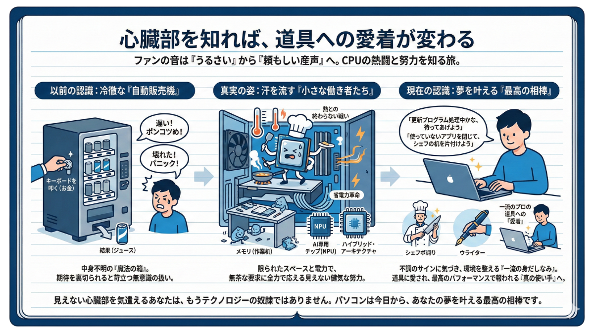 その心臓部の仕組みを理解し、不調のサイン(熱やファンの音)に気づき、最適な環境を整えてあげること。それは決して「パソコンオタクの趣味」などではなく、現代の知的生産者における「一流の身だしなみ」と言えます。
