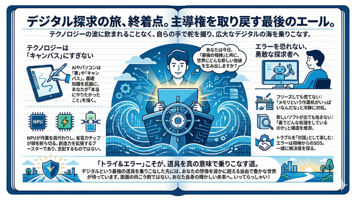 長く続いたIT探求の旅も、いよいよここが終着点です。テクノロジーの波に飲まれるのではなく、自らの手で舵を握り、広大なデジタルの海を乗りこなす。主導権を人間の中に取り戻すための、最後のエールです。