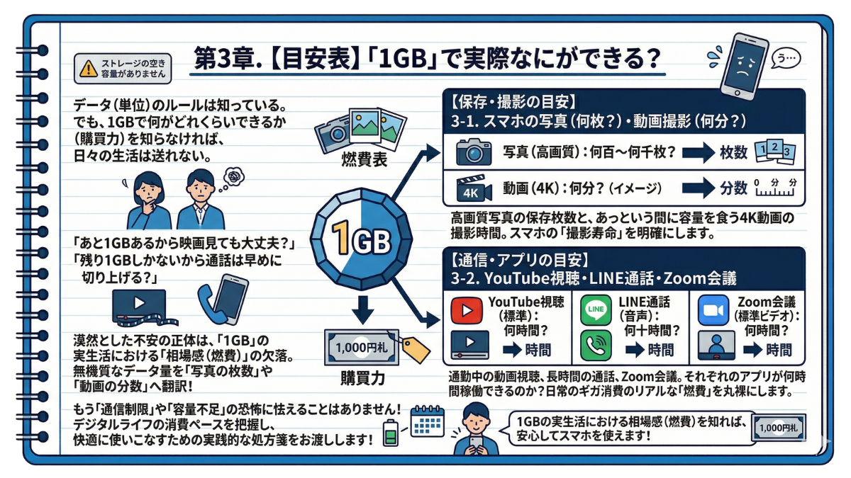 次章では、『第3章. 【目安表】「1GB」で実際なにができる?』をお届けします。動画の視聴時間、LINEの送受信回数、写真の撮影枚数など、日常の行動に直結した目安をスマホでサクッと読める表形式で大解剖。あなた自身の使い方ならどれくらいの容量が必要なのか、ピッタリの答えが見つかります!
