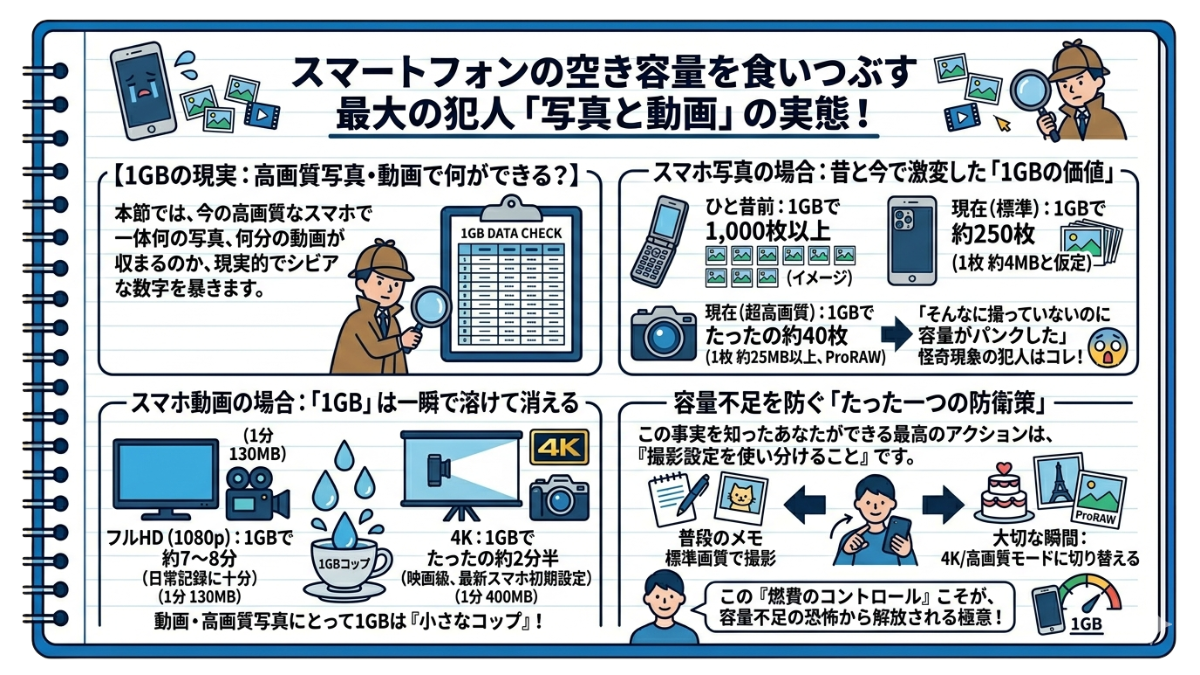 「1GB」の空間があれば、思い出の高画質写真は一体何枚保存できるのか?そして、あっという間に容量を食いつぶす4K動画は、何分回し続けられるのか?あなたのスマホの「撮影寿命」を具体的な数字で明確にします。