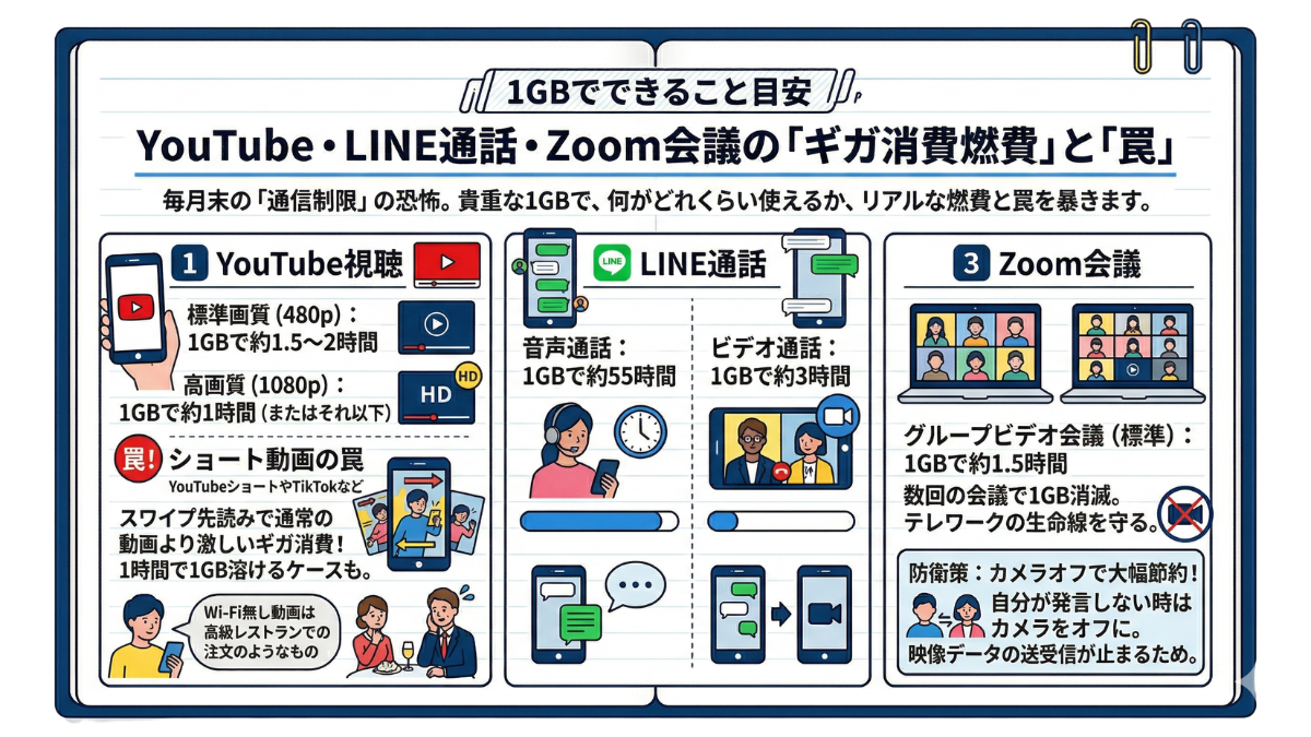 通勤中のYouTube視聴や、長時間のLINE通話、テレワークに必須のZoom会議。「1GB」という通信量で、それぞれのアプリが何時間稼働できるのか?日常のギガ消費のリアルな「燃費」を丸裸にします。