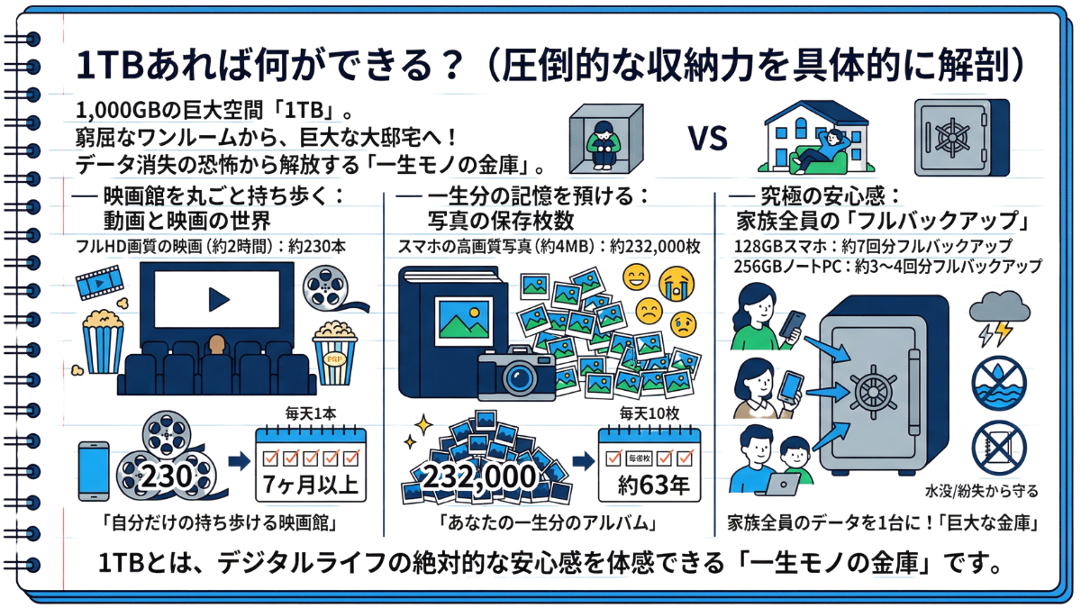 1TBとは、本が100万冊(本1,000冊が入る本棚 × 1,000個)も収蔵されている市立図書館レベルの壮大な空間です。これだけの広さがあれば、家族全員の何十年分の思い出写真や、仕事の膨大な資料を丸ごと放り込んでも、そう簡単には埋まりません。
