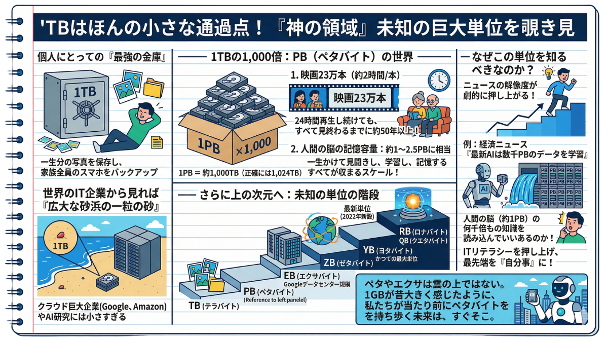 「桁違い」の恐怖と希望を知る: 1TBがどれほど広大なフロンティアなのか。そして、その先に待つ「PB(ペタバイト)」という未知の領域までを俯瞰し、データの海で迷子にならない地図を手に入れます。