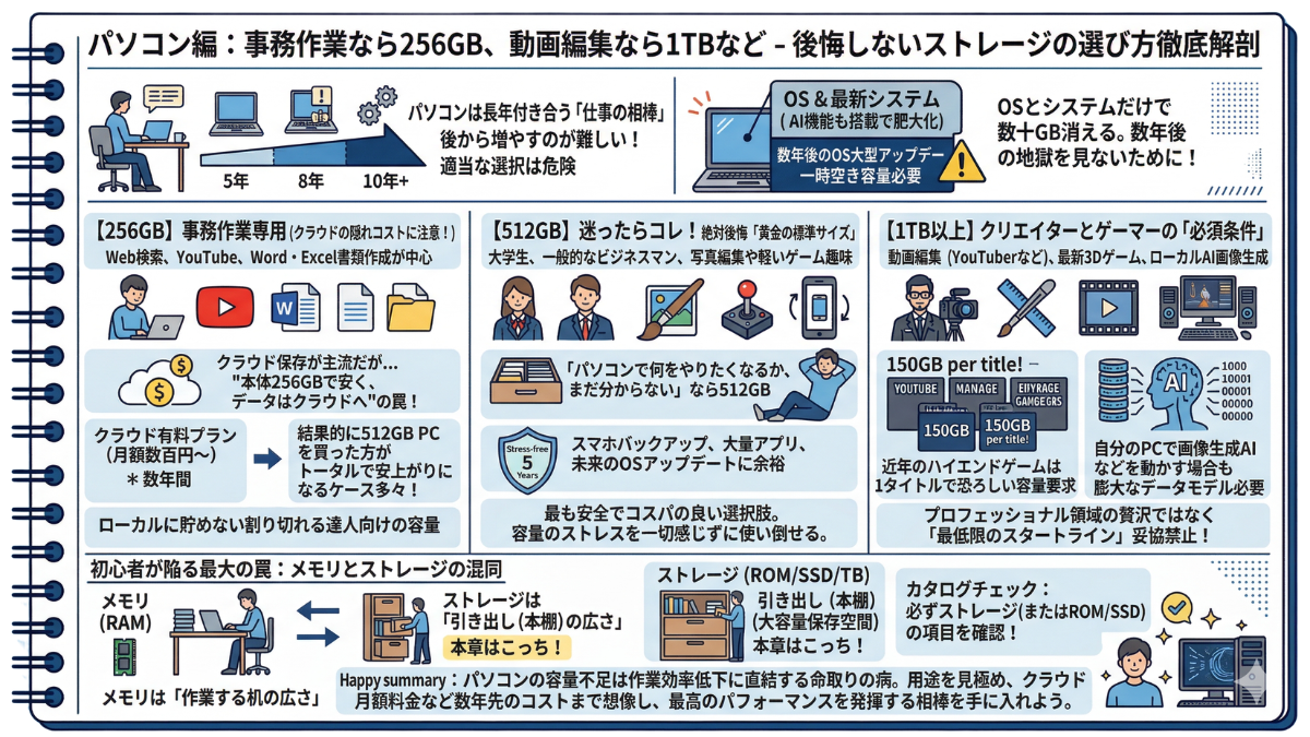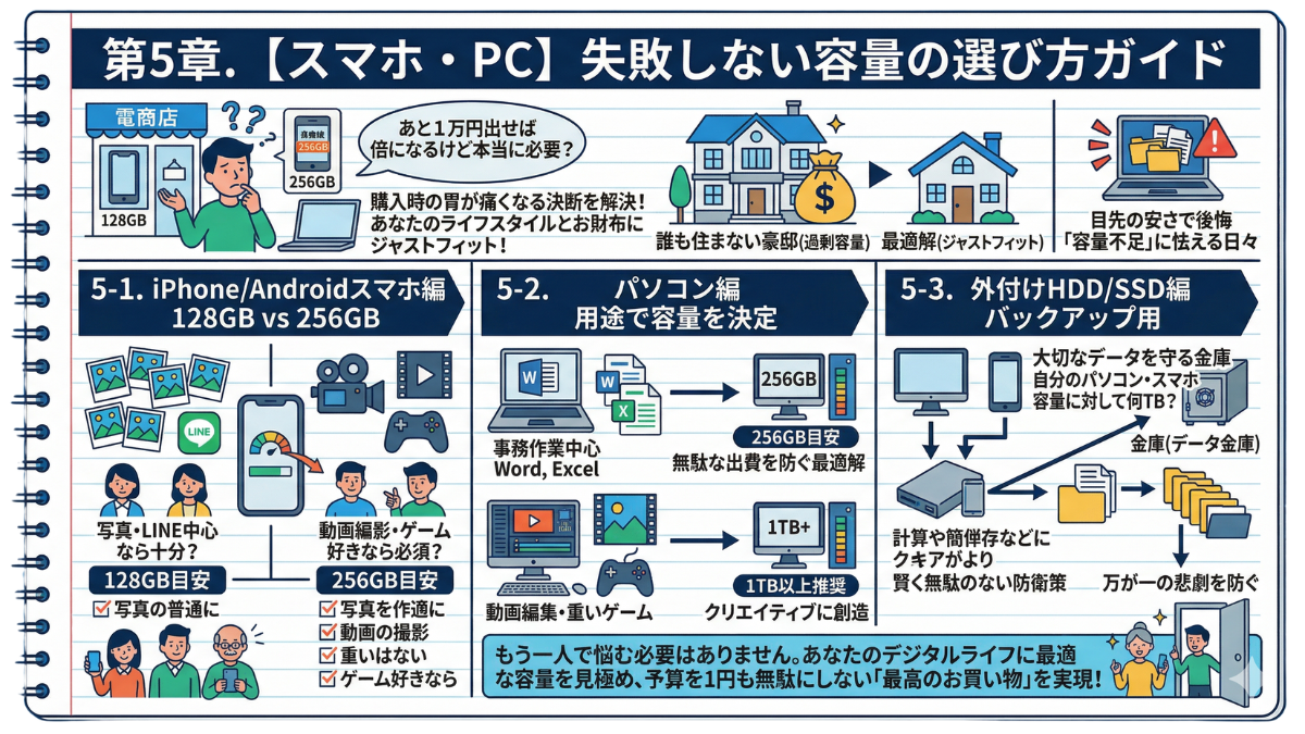 次節は、『5-2. パソコン編: 事務作業なら256GB、動画編集なら1TBなど』へと進みます。スマホよりもさらに高額で、一度買ったら後戻りできないパソコンの容量選び。数年単位で長く付き合う相棒の「絶対に失敗しない黄金比」をズバリ解説します!