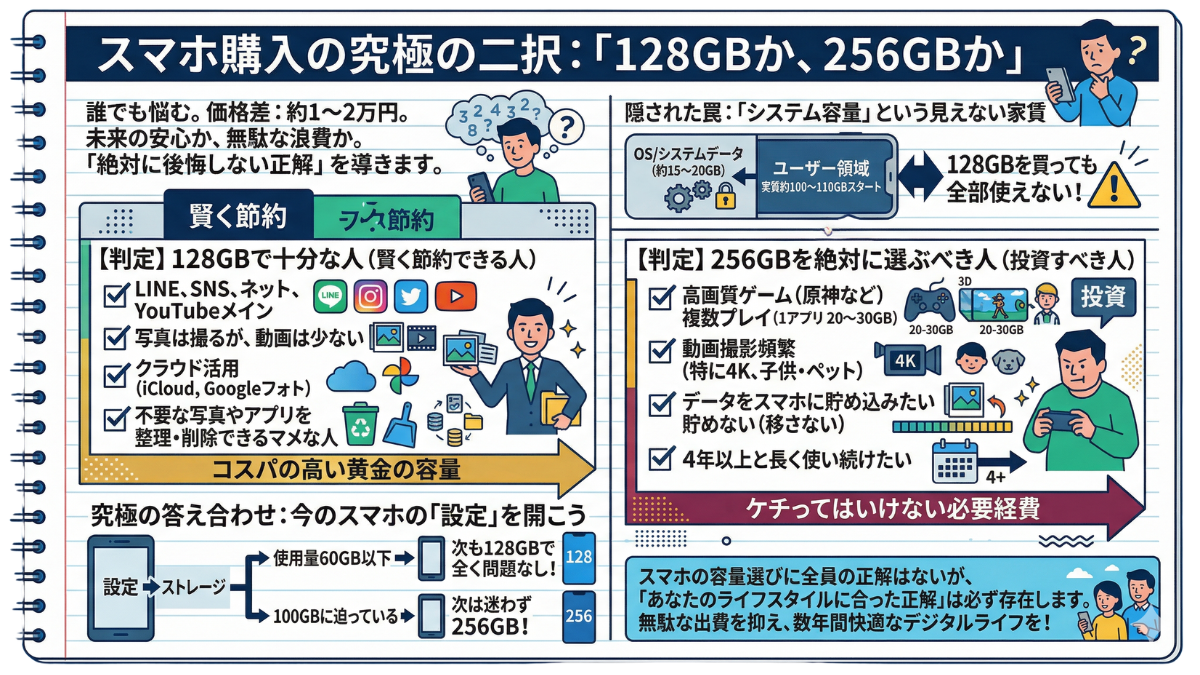 スマホ容量(128GB vs 256GB)の失敗しない選び方 📉 初期容量の罠: OSなどのシステムデータが占有するため、128GBモデルの実質的な空き容量は約100〜110GBからのスタートになる。 👛 128GBで十分な人: SNSや写真撮影がメイン、クラウドサービスを活用する、定期的にデータを整理・削除できる人。 🚀 256GBが必要な人: 重い3Dゲームをする、動画(4K等)を頻繁に撮る、データを一切消したくない、同じ端末を4年以上使いたい人。 💡 究極の判別法: 今使っているスマホの「設定 > ストレージ」を確認し、使用量が60GB以下なら「128GB」、100GBに迫っているなら迷わず「256GB」を選ぶのが最も確実な答え合わせ。