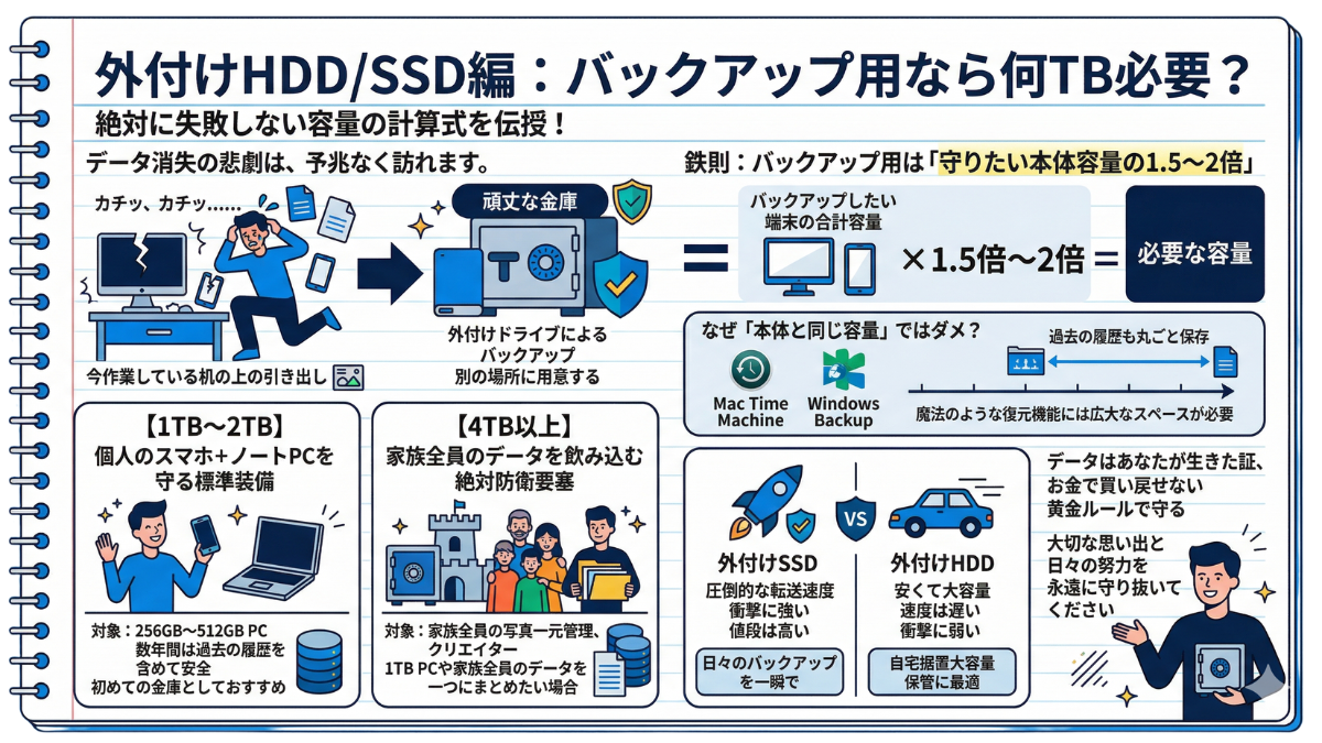 —— 鉄則:バックアップ用は「守りたい本体容量の1.5〜2倍」を買う